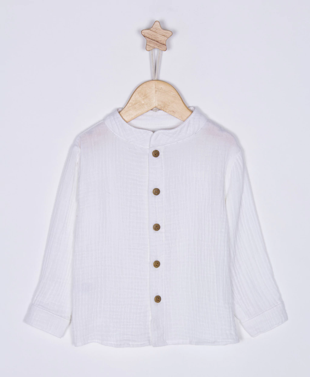 Camisa de bebé en doble gasa de algodón. Con cuello Mao, mangas largas y botones delanteros con logo marcario.