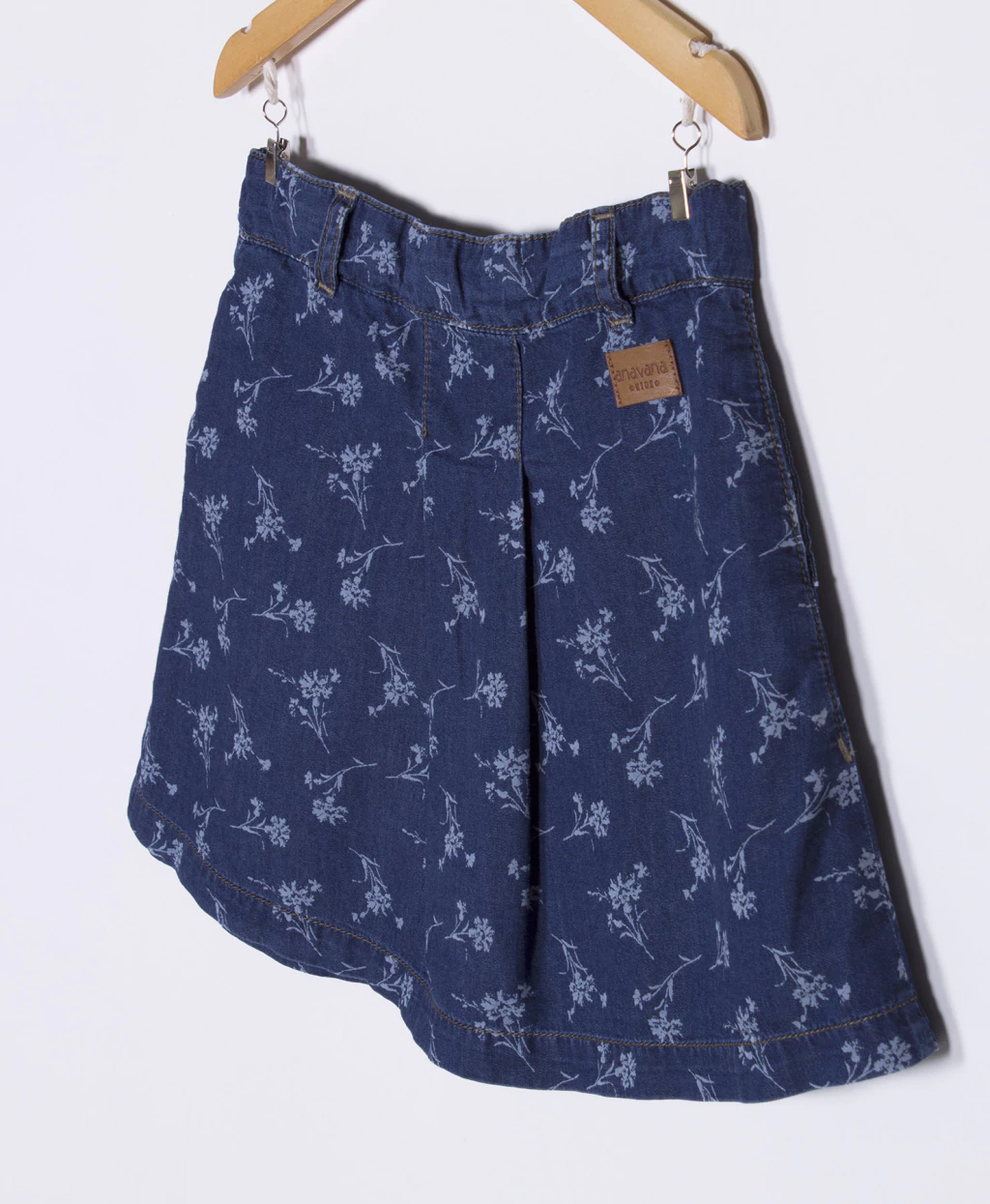 Falda de denim estampado, con botones delanteros de coco, bolsillos laterales y pinzas delateras.