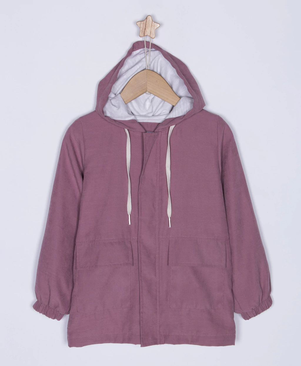 Rompeviento liso forrado con capucha cierre y bolsillo delantero, cordon en cintura y puño con elástico.
