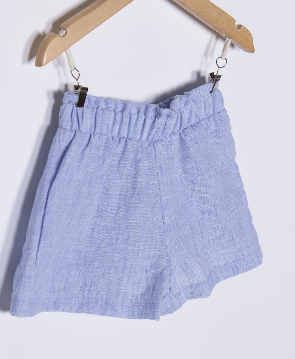Short de lino arrugado fluido con cintura con eslástico y bolsillos traseros con bolado de broderie al tono.