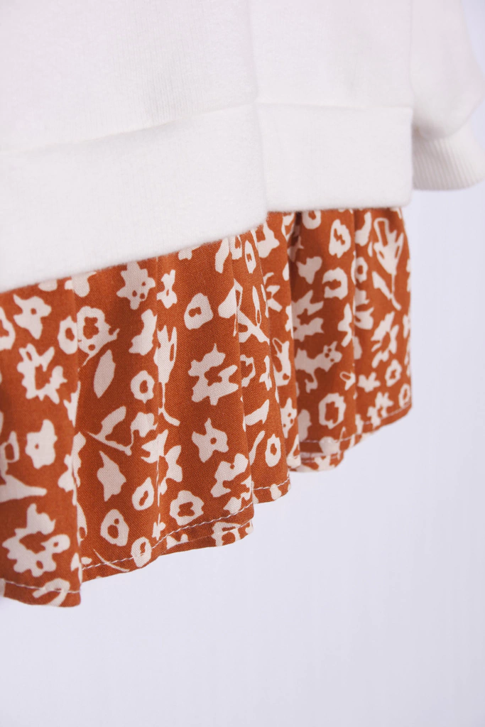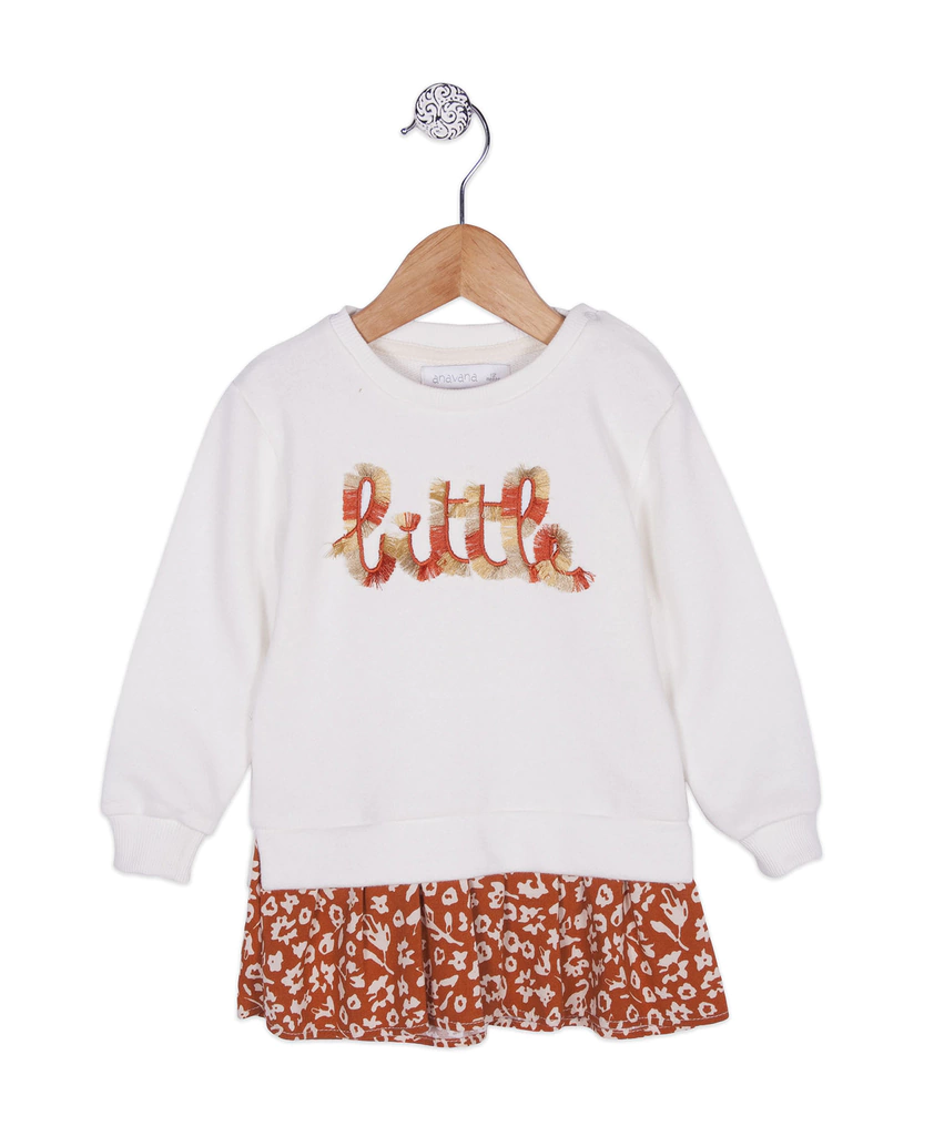 Buzo vestido con bordado y falda estampada. Broche metálico en el cuello.